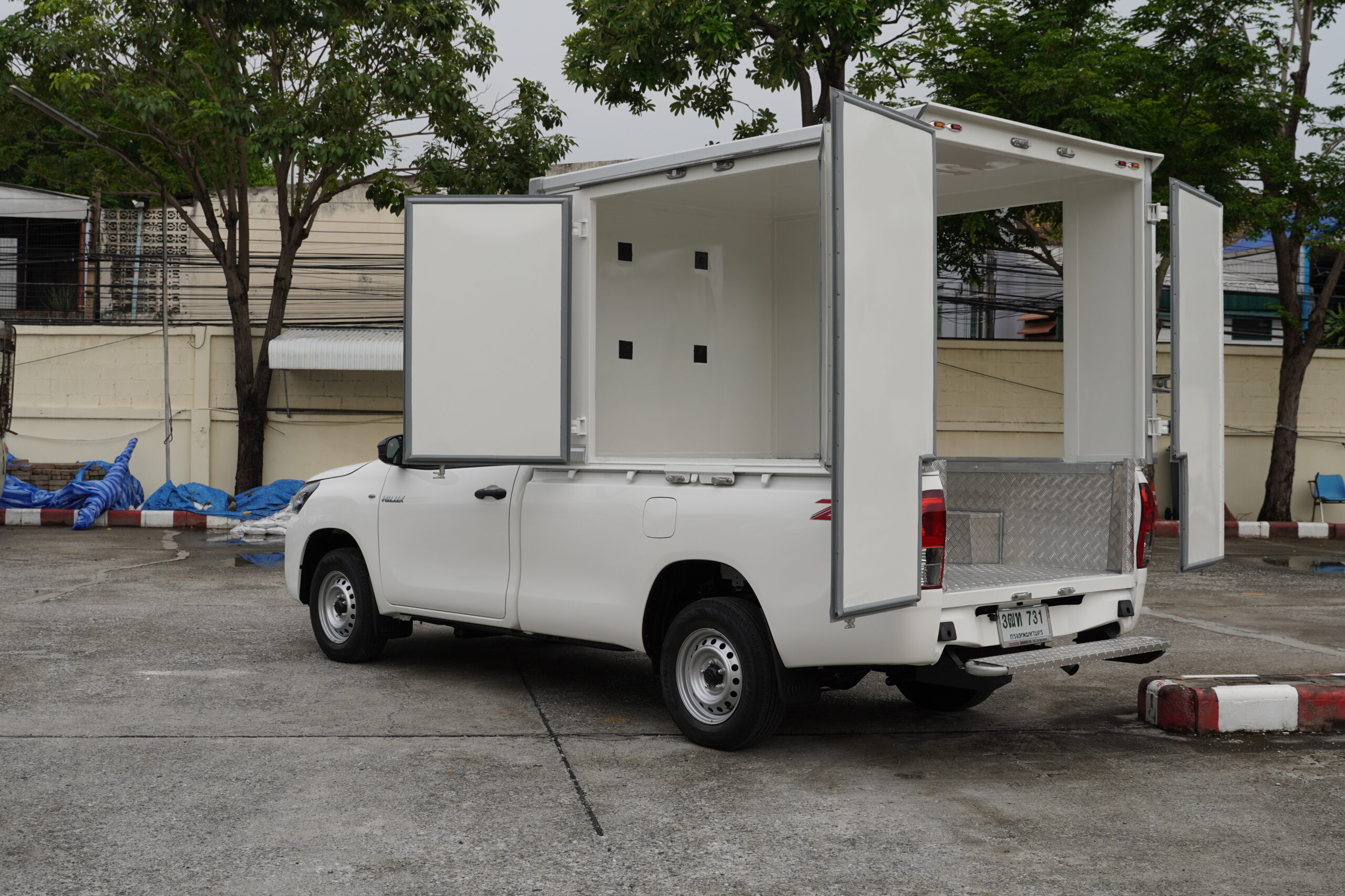 บริษัท สิทธิพรแอสโซซิเอส จำกัด เลือกใช้รถกระบะหลังคาทรงสูง ที่ใช้วัสดุคุณภาพ เพื่อป้องกันความเสียหายที่อาจเกิดขึ้นกับสินค้าที่บรรทุก ร้อมด้วยกระจกบานสไลด์สำหรับระบายอากาศภายในห้องบรรทุก วัสดุที่แข็งแรงทนทาน เหมาะสำหรับการขนส่งสินค้าที่มีมูลค่าสูง